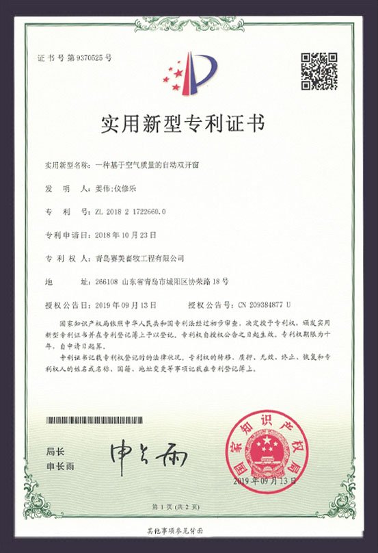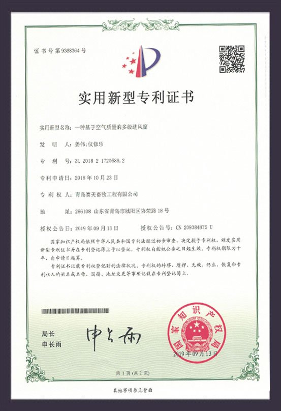多級進風窗專利證書